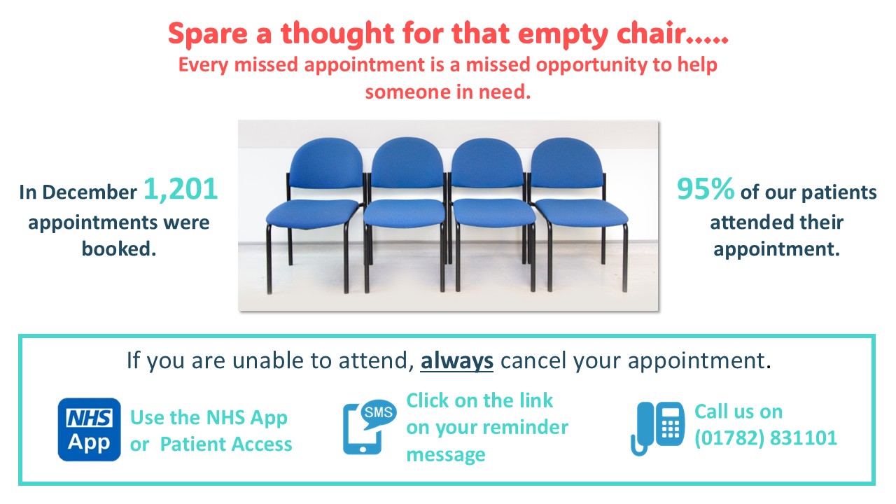 It makes a dramatic difference to us here at Talke Clinic and also to the NHS as a whole if you inform us in good time that you are unable to attend your appointment, we then may be able to offer the slot to another patient.